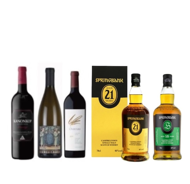 ❶スプリングバンク 21年 ❷スプリングバンク 15年 ❸コングスガード シャルドネナパ・ヴァレー2022 ❹カノンコップ ブラック・ラベル ピノタージュ ❺オーヴァチャー OVERTURE2021 オーパスワン 5本